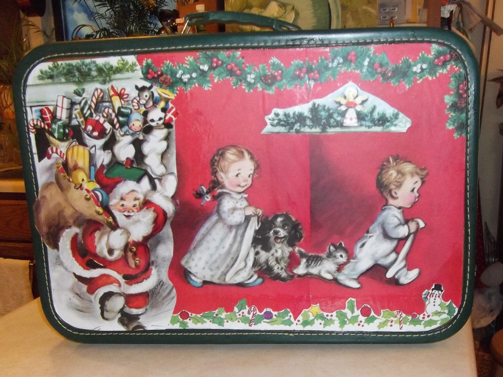 both are works in progress , I have cabin fever - high anxiety - so working with mod-podge helps . I went to another couple of estate sales and got a few items to work with like the small suitcase and a few books I like .